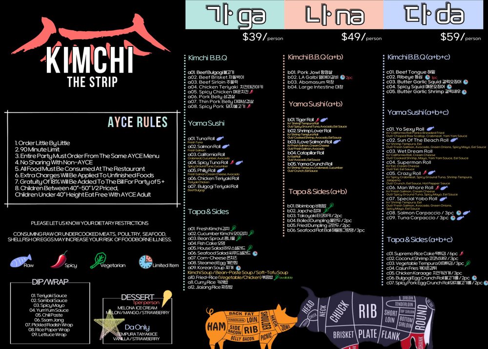 Introducing the menu at Kimchi Korean BBQ, a renowned spot on the Las Vegas Strip, known for its authentic Korean cuisine and AYCE options. Offering a variety of options such as beef, pork, seafood, and sushi, the menu caters to all tastes. Customers rave about the delicious taste and high-quality ingredients, with special mentions for the sulangtang and cucumber kimchi. The all-you-can-eat choices come in three levels, with the sushi rolls being a standout addition. The side dishes and appetizers are plentiful, complementing the main courses well. The restaurant is open 24 hours, making it a perfect spot for any time of day or night. With friendly service and a range of options for groups, families, and individuals, Kimchi Korean BBQ is a must-visit location for a satisfying Korean dining experience.